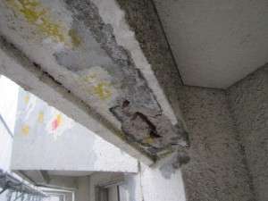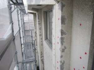 大きなひび割れやコンクリートの浮き部は撤去して左官補修や注入といって下地を補強する