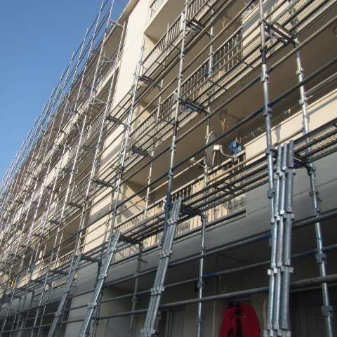 足場仮設中写真ですが、無事に予定通り足場仮設も完了して、壁面調査にはいっていきます。