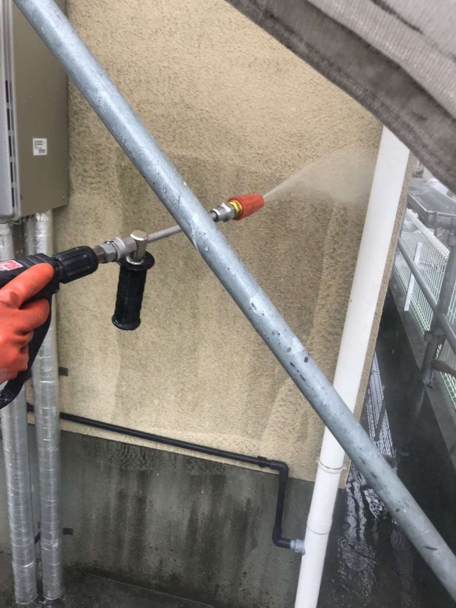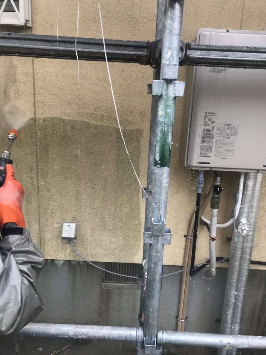 高圧洗浄にてしっかりとカビを除去して施工していきます。