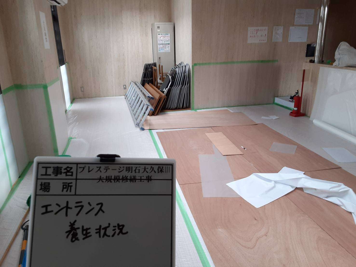 現在エントランスの養生や、駐輪上の屋根の撤去、庭木の伐採作業など