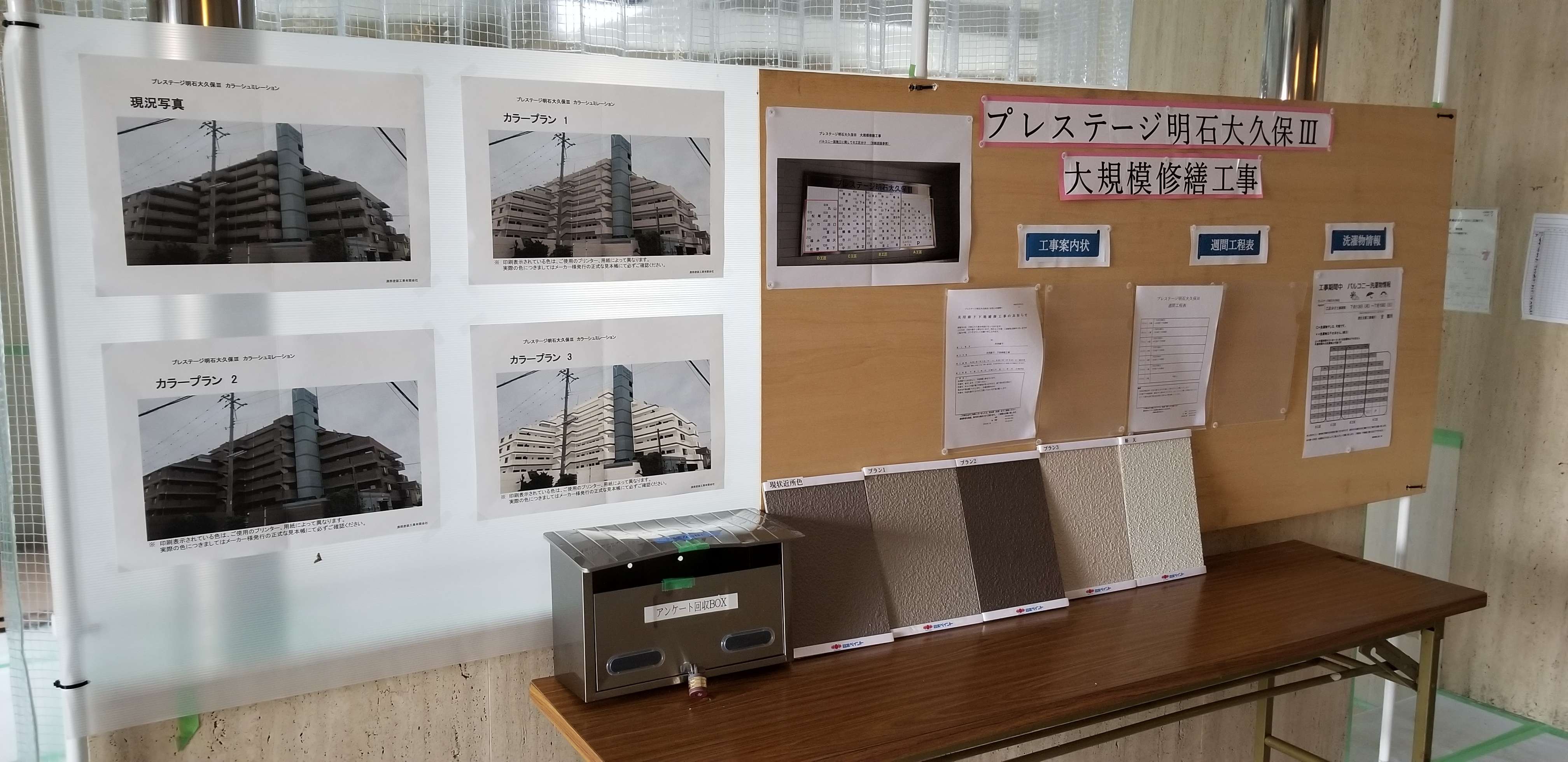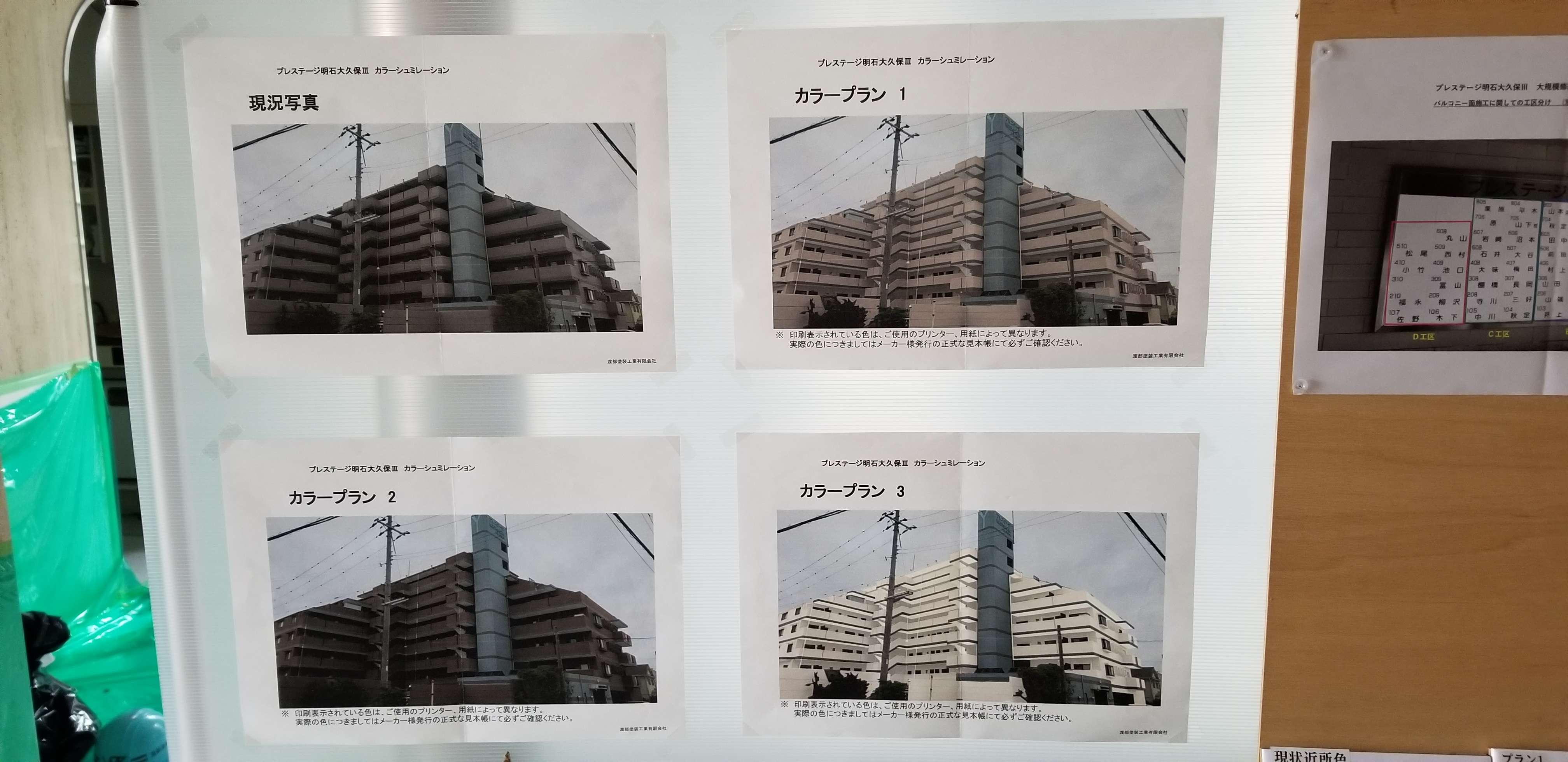 エントランスにて住民全員で新しい外壁のメイン色のアンケート調査を